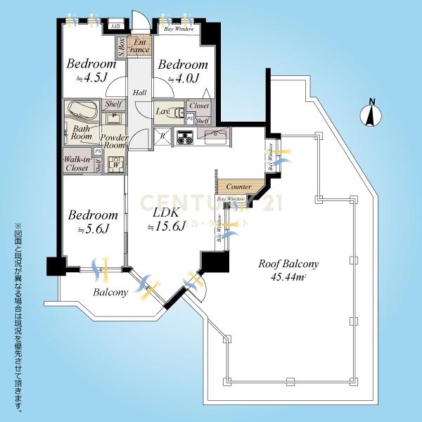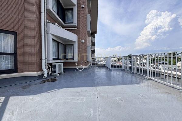 間取りは3LDK、通常バルコニーに加えて45.44平米(約27.49帖)ルーフバルコニーに面するLDK、開放的でアウトドアリビング感覚、陽当たりや眺望は最高評価に近いです。LDKはやや歪な形状も家具レイアウトが活用の参考、プライバシー性の高い通常バルコニーに奥行きがあるのもプラス要素です。