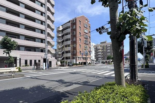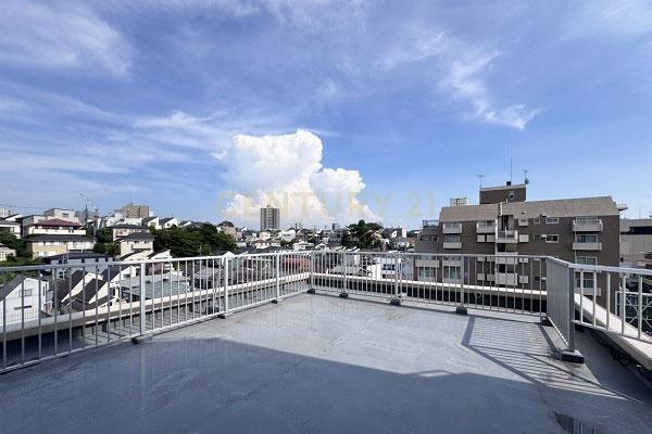 環七沿い大田区山王住所、今回の特徴的な広々ルーフバルコニーは大森山王の緑を望み、該当のお部屋は環七側には面さない配置になります。