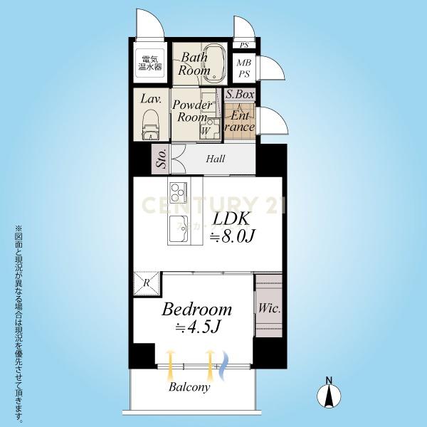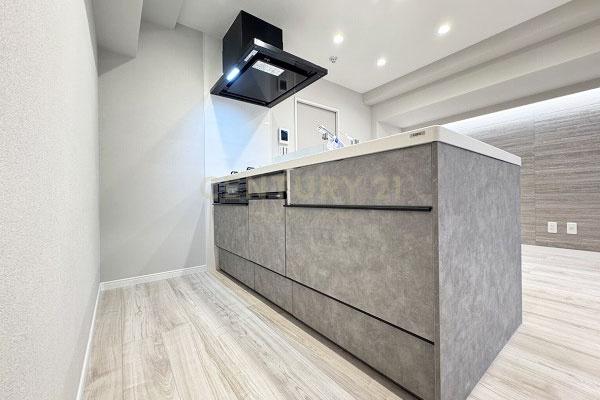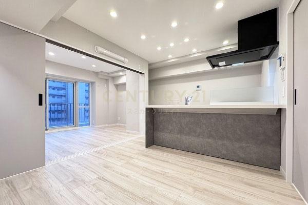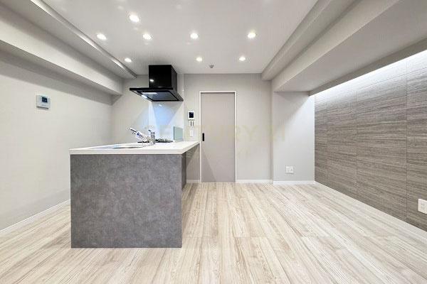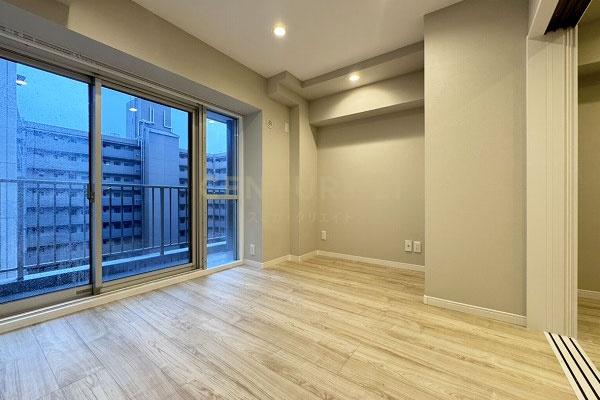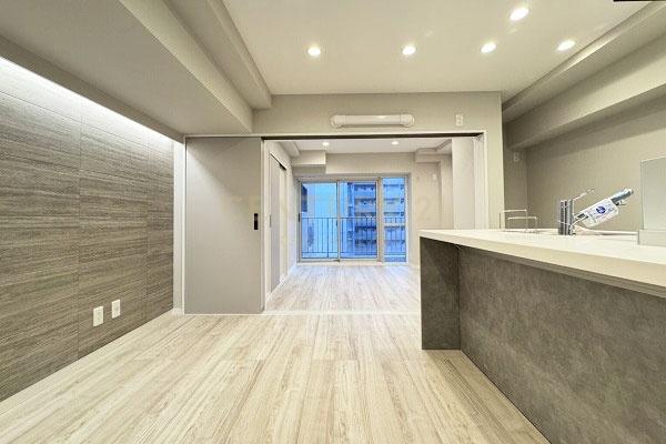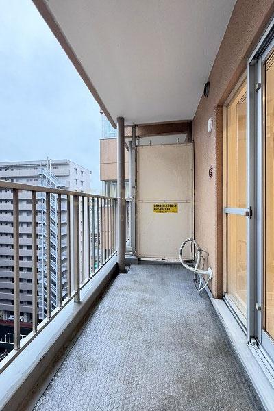 お部屋は14階建て/11階部分の南向きバルコニー、間取りは1LDKです。ただ、可変性はあるもののLDKは約8.0帖でカウンターキッチン採用、表記は1LDKですが実質的には単身者向き1DKタイプです。