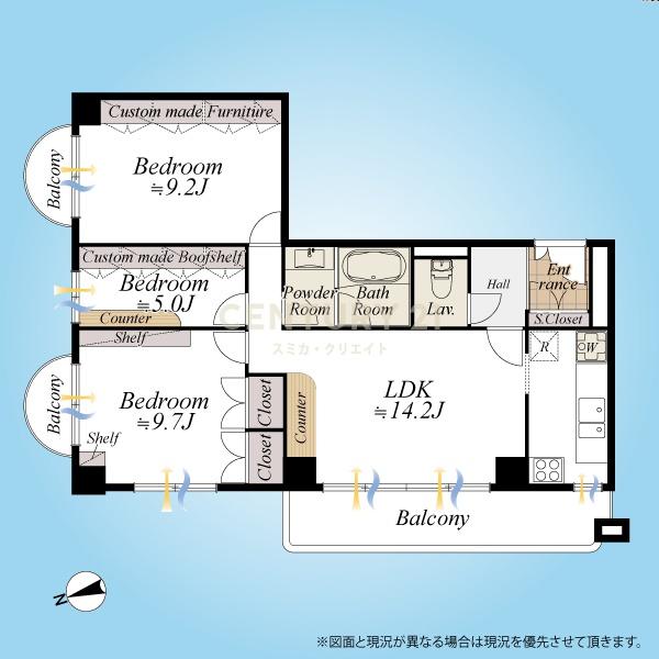 間取りは書斎的な約5.0帖のお部屋やアメリカンなキッチンスペース、カフェテラス的な広めのバルコニーが印象的です。