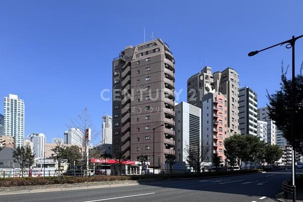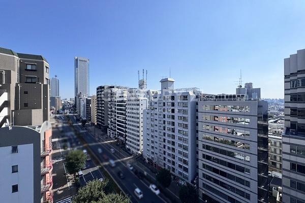 お部屋は14階建て/13階部分の南西角部屋、厳密には南西側バルコニー×北西側の角部屋、南西側が山手通り側なのは特徴的なアール意匠のバルコニー部分で一目瞭然だと思います。外観意匠が細長いものの、2LDK間取りの室内はきれいな形状です。