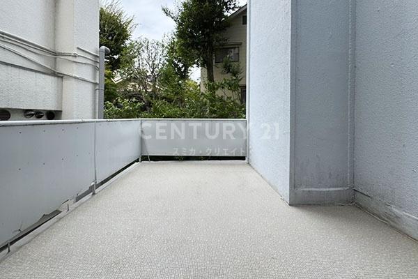 南北両面開口部でLDK+居室の南側がジャーマン通り、陽当たりについては十分ですが眺望は道路幅員の影響で標準評価、主寝室の北側はルーフバルコニー付き、ルーバル画像の向こうに見える緑は尾崎士郎記念館の敷地になります。