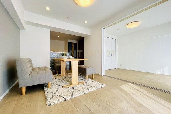 お部屋は最上階南西側バルコニー、2LDKの間取りでLDK+一部屋がバルコニー面、陽当たりや眺望は高評価、キッチン横の作業スペース(DEN)の存在も印象的です。