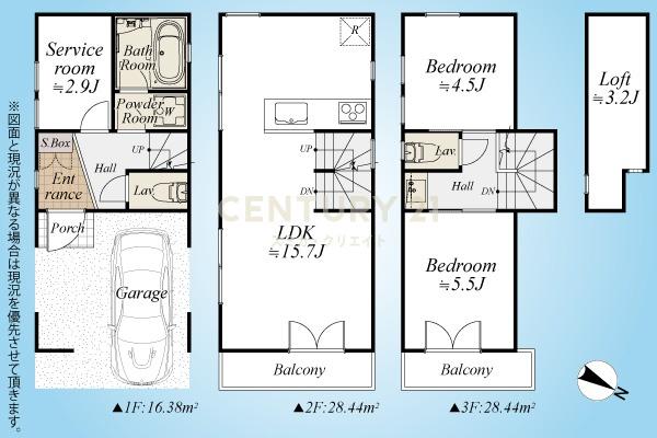 2SLDKの間取りは1階サービスルーム(納戸)を洋室利用可、とは言えあまり広い部屋はなく、収納は三階上部ロフトがメイン、LDKを可能なかぎり広めに確保の設計です。
