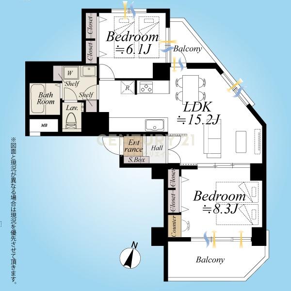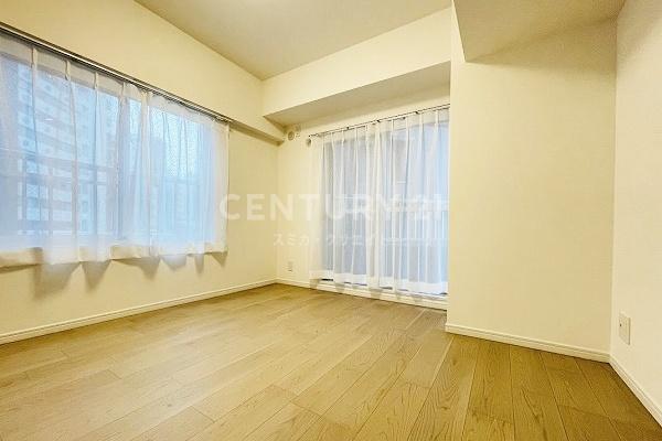 お部屋は13階建て/4階部分の三方向角部屋、間取りは2LDKで居室二部屋を広めに確保、全体的にデッドスペースは極少、LDKを通り浴室や各居室への動線になります。