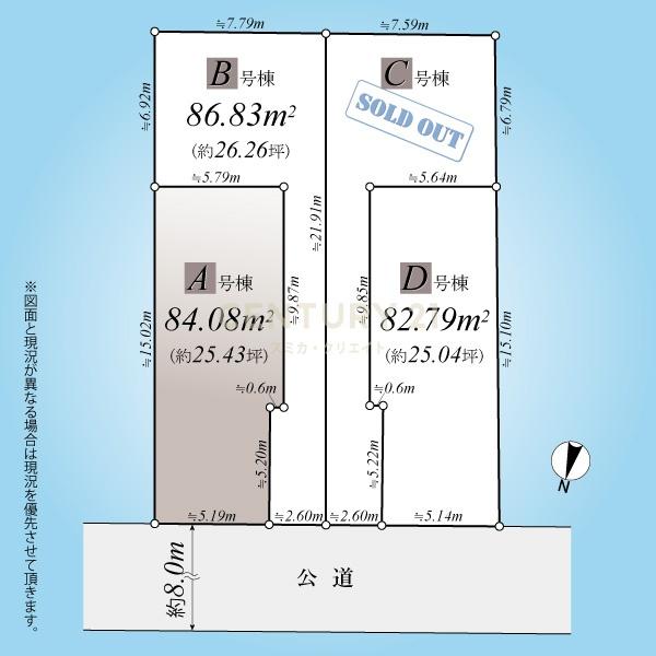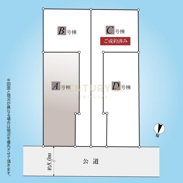 外観写真の通り手前の整形地二棟+奥の旗竿地二棟の全四棟、C棟済みで今回販売はABD三棟になります。