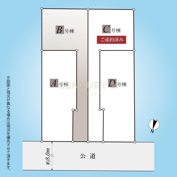 外観写真の通り手前の整形地二棟+奥の旗竿地二棟の全四棟、C棟済みで今回販売はABD三棟になります。