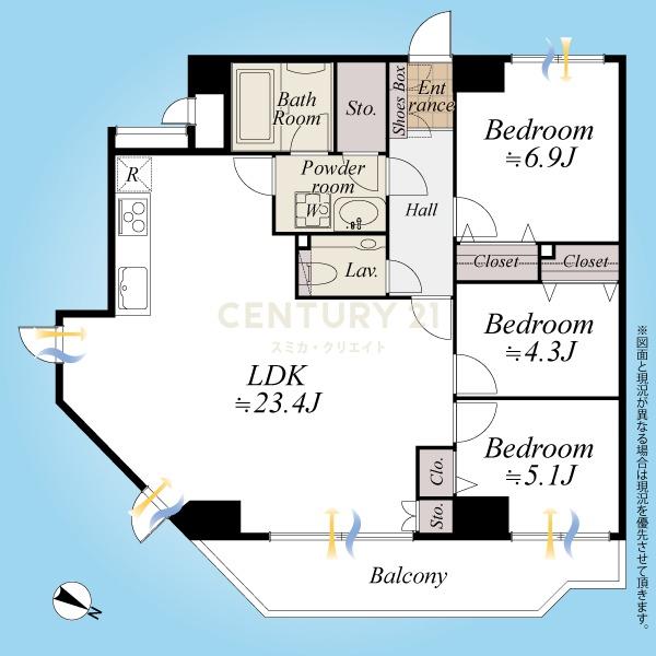3LDKの間取りで特徴はLDK23.4帖の広さ、二面採光で開放的、斜め部分や梁の存在もレイアウトの工夫で吸収可能に見えます。三部屋の居室サイズのバランスも好印象です。
