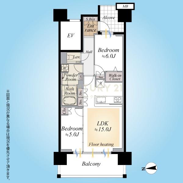 2LDKの間取りはウォールドア開放でLDKを広げる可変性有り、奥行きのあるバルコニーも魅力的です。