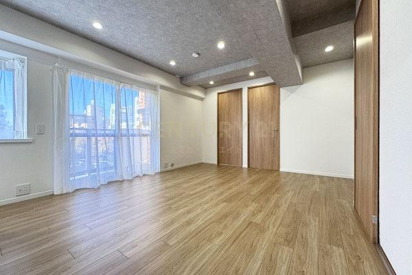 ペット飼育不可、事務所利用可能(要申請、深夜営業不可)、2LDKの間取りでLDKはオープンキッチンタイプ、正方形に近いLDKはレイアウトに工夫が必要です。
