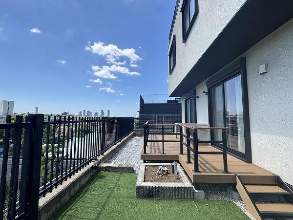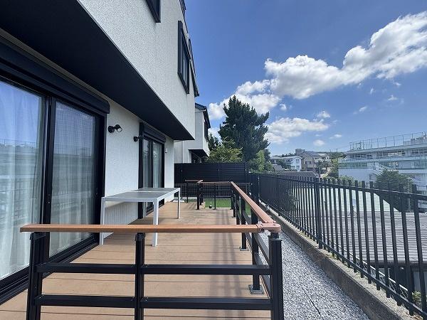 東急大井町線の九品仏駅が最寄り、外観写真の時点で道路逆側の抜け予感はありますが、室内の1階部分ウッドデッキテラス写真で全部屋の陽当たり+眺望の開放感が伝わると思います。ウッドデッキテラスの南東側は眼下に田園調布雙葉小学校を見下ろします。