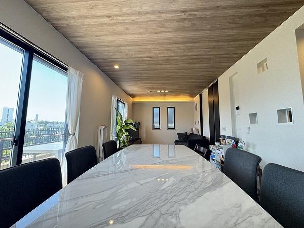 クローゼット 床下収納 シューズインクローゼット 収納スペース ルーフバルコニー ウッドデッキ TVインターホン 日当り良好 2沿線以上利用可 高台に立地 閑静な住宅地 市街地が近い 前道6m以上 階建 3階建以上 部屋向き 南東向き 全室2面採光 通風良好 全居室フローリング 独立洗面台 浴室に窓 トイレ2ヶ所 温水洗浄便座 公共下水(雑排水) 眺望良好 周辺交通量少なめ スーパー 徒歩10分以内 小学校 徒歩10分以内 フローリング 床暖房 システムキッチン カウンターキッチン 食器洗乾燥機 ガスコンロ コンロ口数 三口 追い焚き 浴室乾燥機