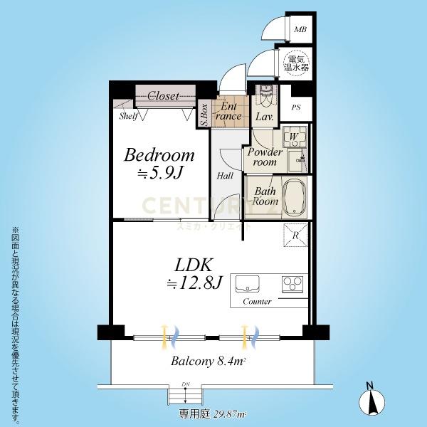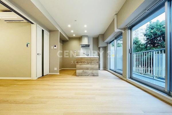 お部屋は1階部分専用庭付き、1LDKの間取り、LDKの広さと形状が間取り評価の要因でです。