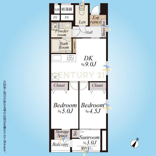 間取りは2SLDK、バルコニーとは別に雨天時に役立つサンルーム有り、開口部はあるもののLDKのサイズと位置で間取り評価は下げています。