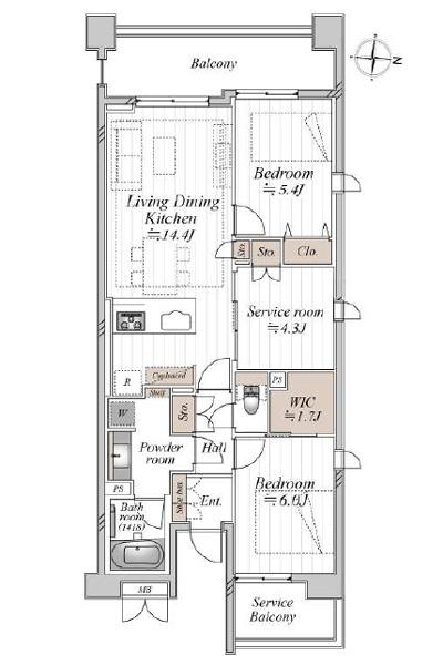 アウトフレーム工法採用で各部屋がきれいな形状、そのため専有面積の割に部屋数や各部屋サイズが広く、適度な収納量やサービスバルコニーの存在含め間取りは好印象です。一新の設備や共用サービス等、装備関係の充実度も高めの評価です。