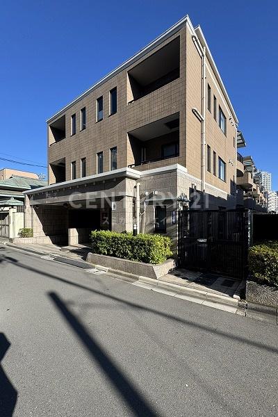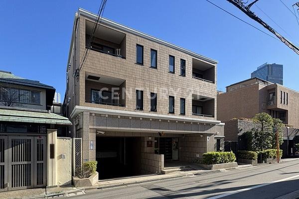 赤坂駅と乃木坂駅と青山一丁目駅がをほぼ同距離、港区赤坂七丁目の高台で赤坂小学校側視点で稲荷坂上、1997年築ブラウン基調の重厚感ある石貼りの門構えとタイルが印象的な低層マンション二階部分になります。