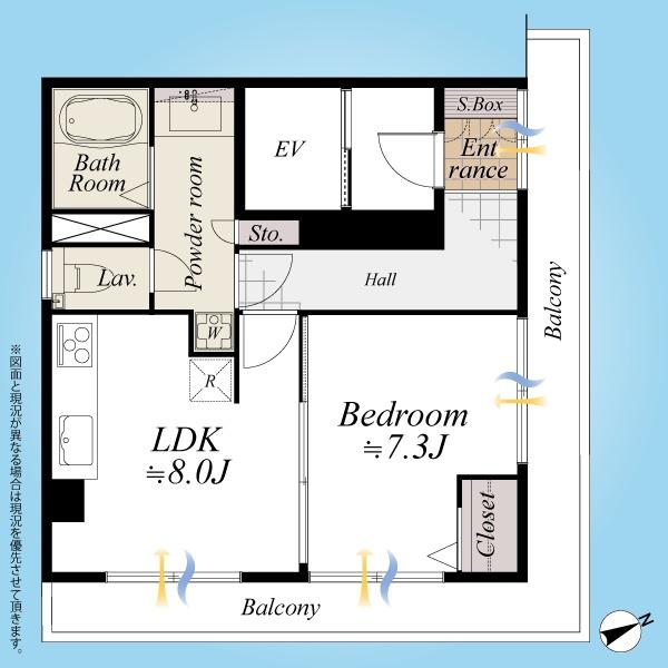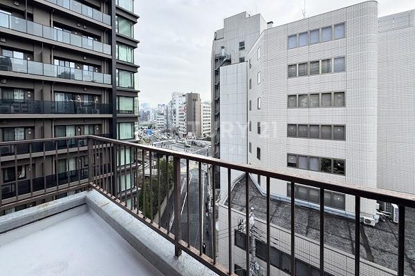 お部屋は最上階8階部分でフロアには本部屋のみです。逆L字型バルコニーでLDK+居室に加えて玄関も明るいのが特徴です。間取りは特殊でLDK記載ですがほぼDK、間仕切りが透明なので透過性があるのはプラス要素です。トイレが明るく、洗面化粧室が広めです。