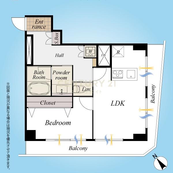 南向き角部屋で二面バルコニー、平面図上この広さを考えるとホールが広く、実際にLDKの広さ等は要確認です。