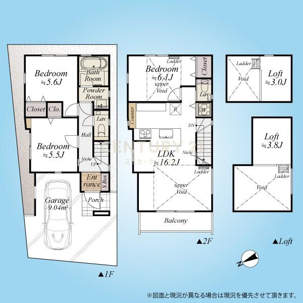どちらも車庫付き(車種制限有り)二階建て3LDKタイプ、LD吹き抜けかつ二か所のロフト付きです。