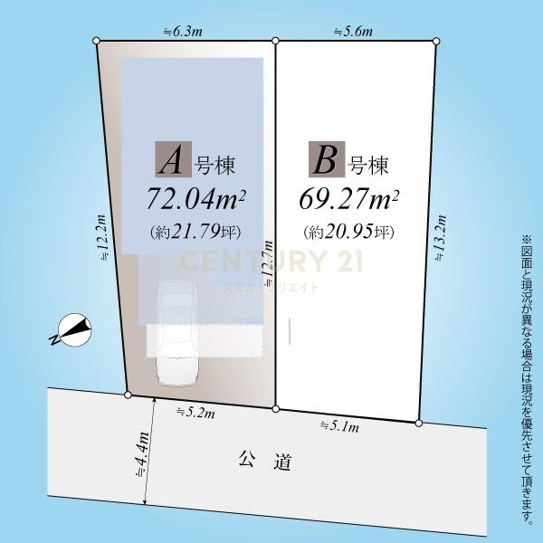 北西側公道面の建物完成済み整形地の二棟横並び、間取りはほぼ反転です。